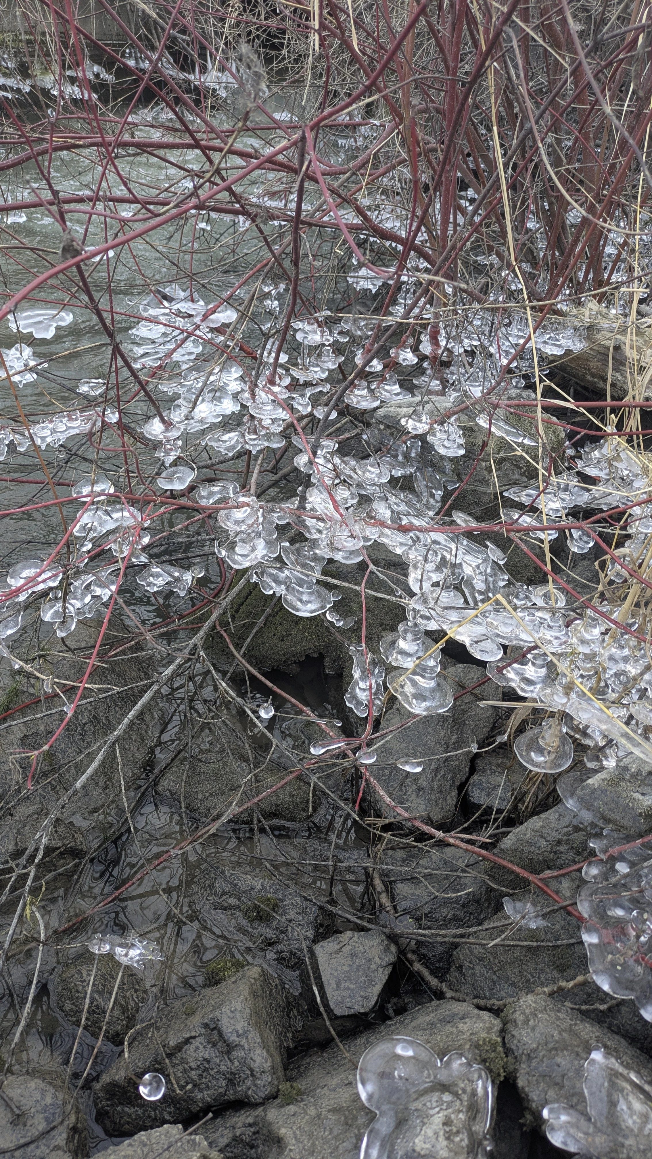 No, the day was for something else. It was a day to be at the creek. The crashing of melting, vertical ice chunks along with the whip-pang of the creek ice cracking in the occasional rays of winter sun were the only interruptions to the peace. The water was flowing in front of me from the open to under an inch deep layer of ice and back out again into the Kootenai river. The birds, though quiet, were there. A large quantity of pine siskens and juncos were in the melted ice-laden red osier dogwood, and after walking down to the dock at the Mouth for a quick peek at what was going on, I watched groups of mergansers dive for food.